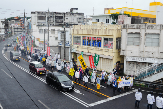 图为2022年5月14日,约70个团体、1000人在驻日美军普天间基地到嘉手纳基地约九公里的路段上参加“和平行进”游行,呼吁减轻美军基地给当地带来的负担。(新华社记者张笑宇摄)