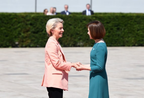 6月1日,在摩尔多瓦布尔博阿克,摩尔多瓦总统桑杜(右)欢迎前来参加第二届欧洲政治共同体领导人会议的欧盟委员会主席冯德莱恩。新华社记者连漪摄