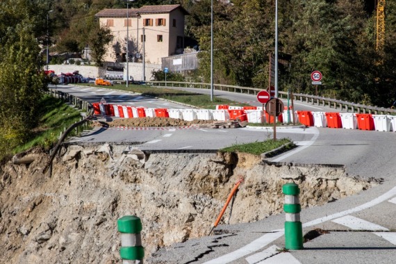 这是2020年10月12日在法国南部城市尼斯附近的圣马丹韦叙比拍摄的洪灾过后被损坏的道路。新华社发(法布里斯·桑佩尔摄)