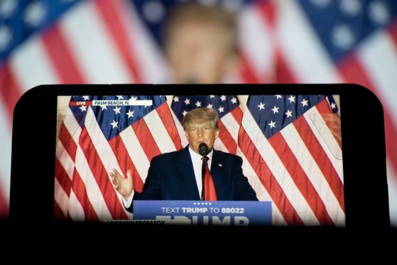 2022年11月15日拍摄的电子屏幕显示,美国前总统、共和党人特朗普在佛罗里达州的海湖庄园发表讲话,宣布正式启动2024年总统竞选活动。新华社记者刘杰摄