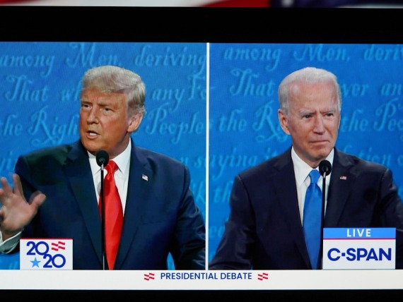 这张2020年10月22日在美国弗吉尼亚州阿灵顿拍摄的视频画面显示,时任美国总统特朗普(左)与民主党总统候选人拜登在田纳西州纳什维尔市参加最后一场总统候选人电视辩论。新华社记者刘杰摄