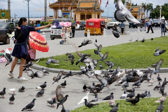 这是2020年9月19日,市民在柬埔寨金边王宫前的广场喂鸽子。新华社发(索万纳拉摄)