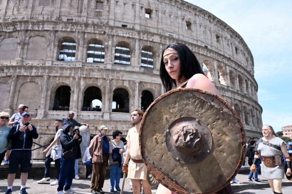 4月23日,人们在意大利罗马参加庆祝游行。新华社发(阿尔贝托·林格里亚摄)