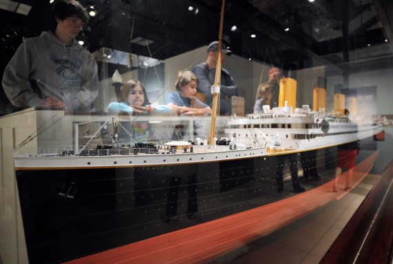 2012年4月5日,在美国首都华盛顿国家地理博物馆举行的“泰坦尼克”号沉船百年展上,参观者观看一艘约5.5米长的“泰坦尼克”号模型。新华社记者王轶欧摄