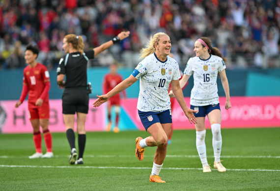 7月22日,美国队球员琳赛·霍兰(右二)庆祝进球。新华社记者 郭磊 摄
