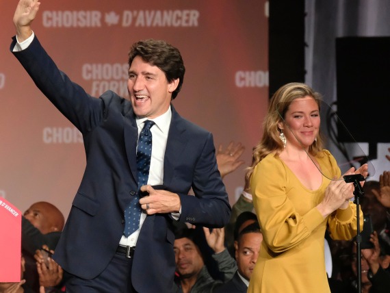 2019年10月21日,在加拿大蒙特利尔,加拿大总理特鲁多和妻子索菲在自由党竞选总部参加活动。新华社发(拉菲·克尔德摄)