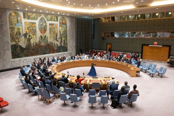 这是6月30日在位于纽约的联合国总部拍摄的安理会会议现场。联合国安理会6月30日一致通过决议,决定结束联合国马里多层面综合稳定团(马里稳定团)授权,并就缩编、撤出等作出具体安排。新华社发(联合国供图/埃瑟金德尔·德贝卜摄)
