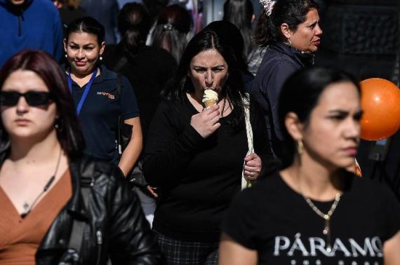 8月4日,行人在智利首都圣地亚哥街头吃冰淇淋。近期,正值冬季的阿根廷、智利等南美国家部分地区遭遇异常高温天气。新华社发(豪尔赫·比列加斯摄)
