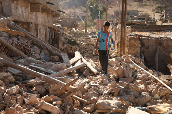9月10日,在摩洛哥震中附近的艾米兹米兹村,一名男孩从损毁的建筑上走过。(新华社发 艾萨摄)
