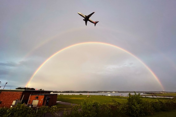 2022年5月15日,在美国弗吉尼亚州阿灵顿,一架飞机从暴雨过后的双彩虹旁飞过。新华社记者刘杰摄