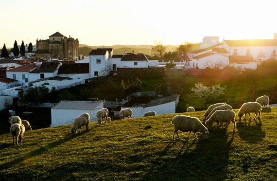 2018年3月31日,在西班牙安达卢西亚自治区卡萨利亚镇,羊群在草地上吃草。新华社记者郭求达摄