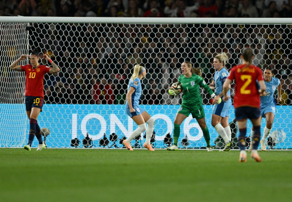 2023年8月20日,英格兰队守门员厄普斯(左三)在扑救成功后庆祝。当日,在澳大利亚悉尼举行的2023年国际足联女足世界杯决赛中,西班牙队以1比0战胜英格兰队,获得冠军。新华社记者 李一博 摄