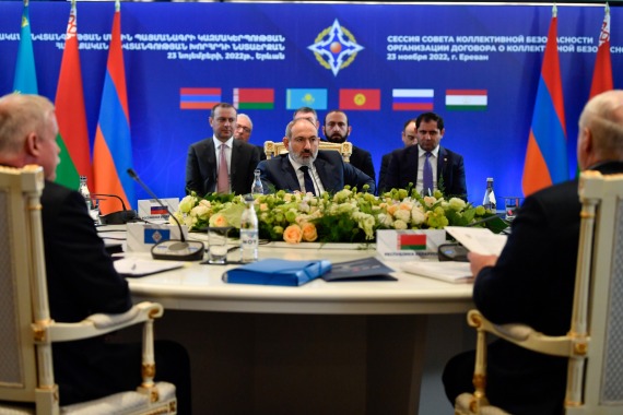 2022年11月23日,亚美尼亚总理帕什尼扬(中)主持在埃里温举行的集体安全条约组织(集安组织)理事会会议。新华社发(阿萨塔·耶塞恩茨摄)