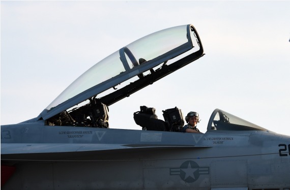 2017年7月22日,在美国弗吉尼亚州诺福克海军基地,飞行员坐在“福特”号航母上的F/A-18战斗机中。新华社记者殷博古摄