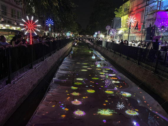 新华社曼谷11月28日电(记者陈家宝) 满月之下,接踵而至的水灯影像投射在穿行曼谷老城区的翁昂运河上。流淌了200多年的小河首次邂逅斑斓的虚拟水灯,漆黑河面顿如星河灿烂。