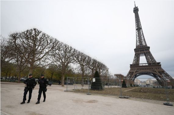 12月3日,宪兵在法国巴黎埃菲尔铁塔附近巡逻。新华社记者高静摄
