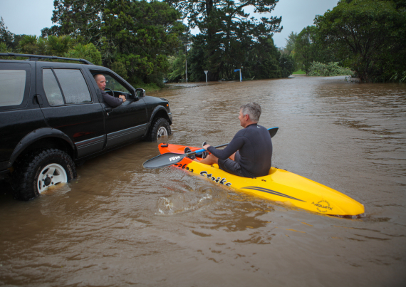图为2023年2月14日,在新西兰奥克兰,一名男子在积水路段划船出行。新华社发(赵纲 摄)