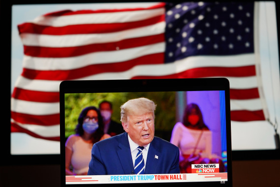 这张2020年10月15日在美国弗吉尼亚州阿灵顿拍摄的照片显示,电视上正在播放时任美国总统、共和党总统候选人特朗普在佛罗里达州迈阿密市参加选民问答会的节目。(新华社记者刘杰摄)
