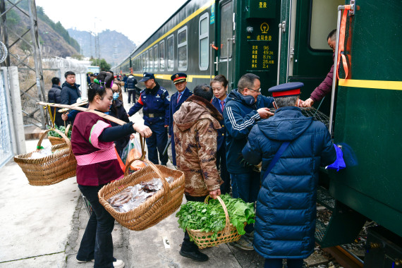 沿线村民搭乘慢火车,出门走亲访友,把深山里的鸡鸭牛羊、瓜果蔬菜、土特产品搬上火车,再运到县城售卖。在这个热闹的“新春山货集市”中,新鲜的蔬菜味、满满的生活味、浓浓的人情味正交织升腾。