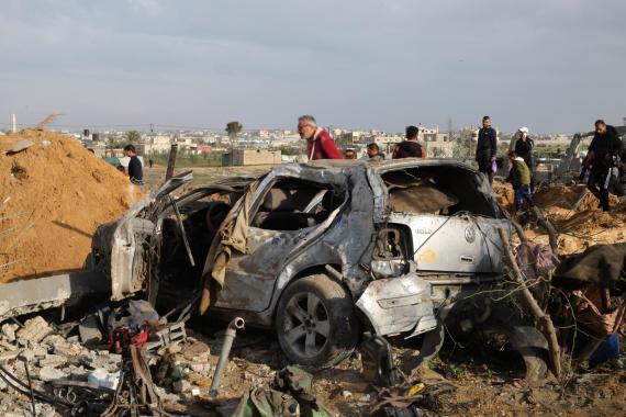 2月18日,在加沙地带南部城市拉法,巴勒斯坦人查看以军空袭后的损毁情况。新华社发(哈立德·奥马尔摄)