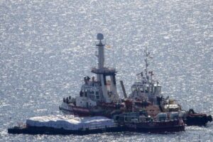 3月12日,一艘为加沙运送人道主义援助物资的驳船从塞浦路斯拉纳卡港出发。新华社发(乔治·克里斯托弗鲁摄)