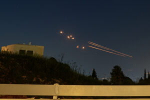 这张4月12日在以色列北部胡拉山谷拍摄的照片显示,以色列“铁穹”防空系统启动拦截从黎巴嫩发射的火箭弹。新华社发(阿亚尔·马戈林摄/基尼图片社)