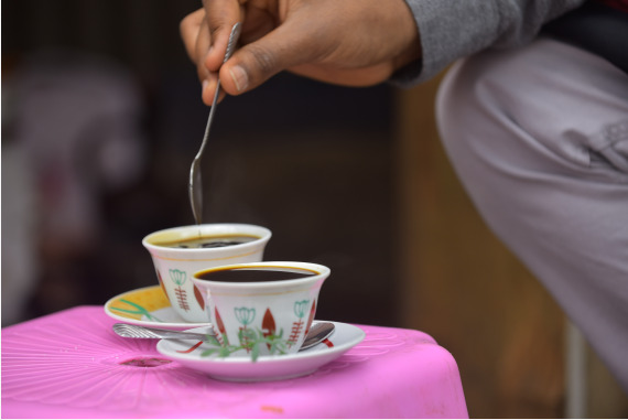 2021年5月14日,顾客在埃塞俄比亚亚的斯亚贝巴街头的咖啡摊品尝咖啡。新华社发(迈克尔·特韦尔德摄)