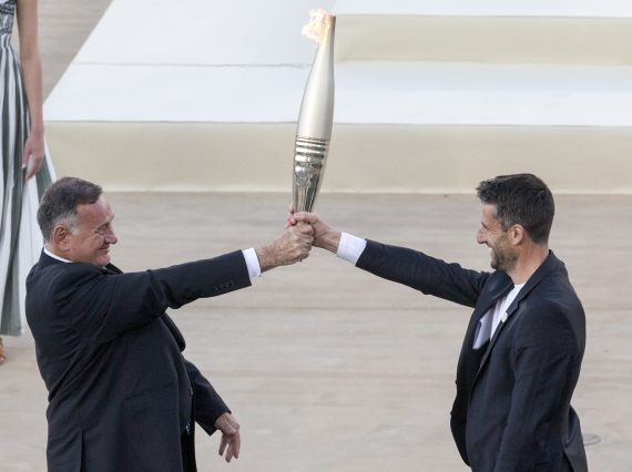 4月26日,希腊奥委会主席卡普拉洛斯(左)将火炬交给巴黎奥组委主席埃斯坦盖。新华社发(马里奥斯·罗洛斯摄)