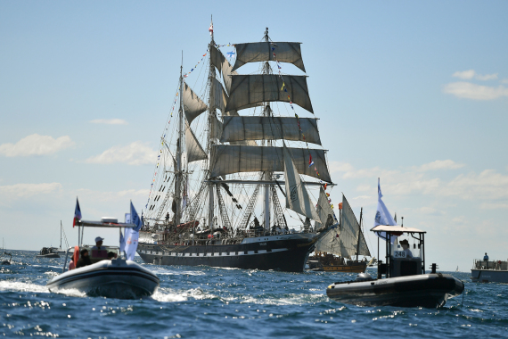 中午约11时,承载着奥运火种的“贝勒姆”号帆船抵达马赛港口附近海域。超过1000艘各类船只在海面迎接火种的抵达,并伴随“贝勒姆”号沿着马赛老港附近沿岸进行海上巡游。