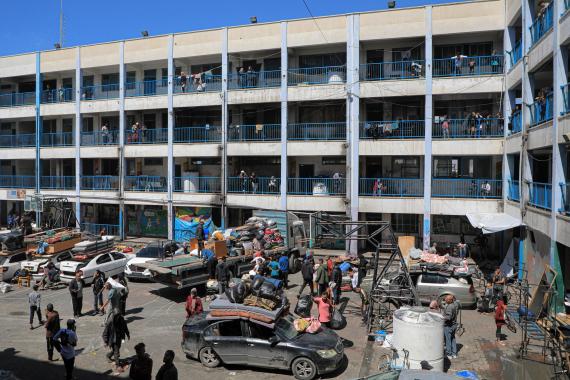 5月6日,巴勒斯坦人准备从加沙地带南部城市拉法一处由学校改建的避难所撤离。新华社发(里泽克·阿卜杜勒贾瓦德摄)