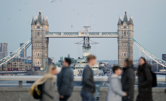 1月28日,行人走在英国伦敦桥上。新华社记者李颖摄