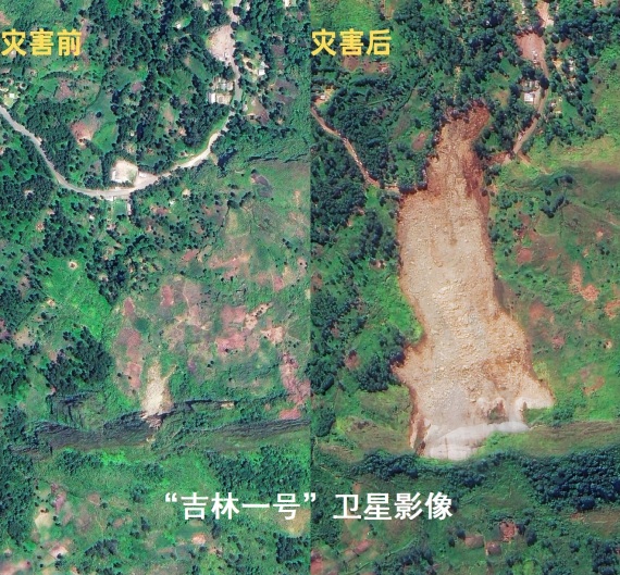 这张卫星影像拼图显示的是2023年11月13日(左)和2024年5月28日巴布亚新几内亚恩加省山体滑坡发生前后的画面。长光卫星技术股份有限公司供图