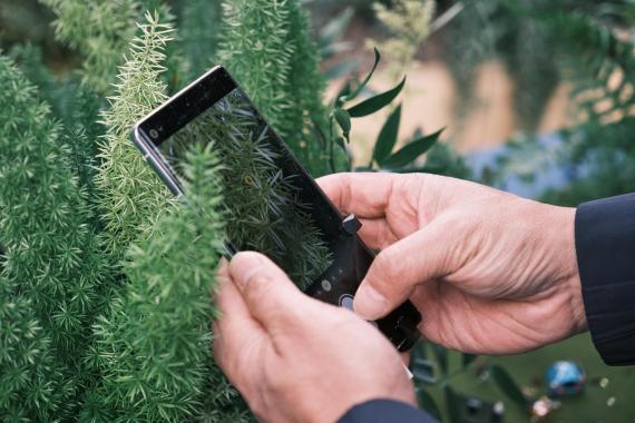 2023年3月2日,参会人员在西班牙巴塞罗那2023世界移动通信大会上的谷歌公司展区试用手机微距拍照功能。新华社记者孟鼎博摄