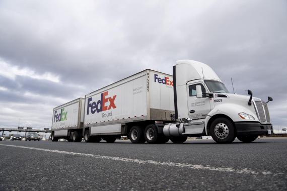 2021年10月26日,集装箱卡车离开美国马里兰州巴尔的摩市港口。新华社记者刘杰摄