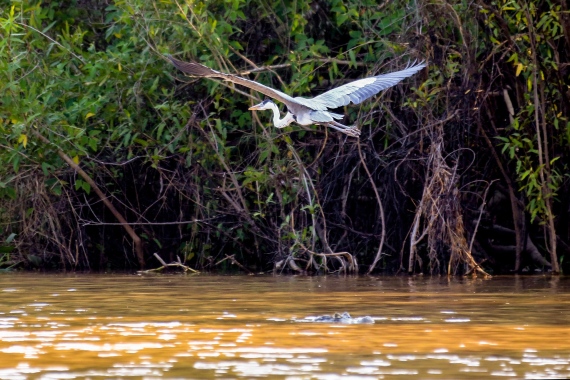 在南美洲中部潘塔纳尔湿地,鹭鸟飞过潜伏于水中的鳄鱼(2015年12月5日摄)。新华社记者张强摄