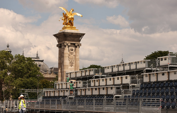 这是6月4日在位于法国巴黎市中心的亚历山大三世桥拍摄的临时比赛场地搭建现场。新华社记者 高静 摄