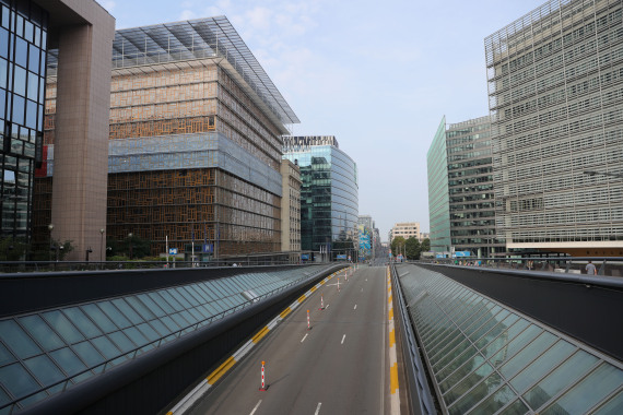 这是2021年9月19日在比利时布鲁塞尔的欧盟总部附近拍摄的公路。当日,比利时布鲁塞尔举行2021年无车日活动,从9时30分至19时,市区内除公交车、出租车和部分特种车辆外,其他机动车辆禁止上路,市内公共交通免费。新华社记者郑焕松摄
