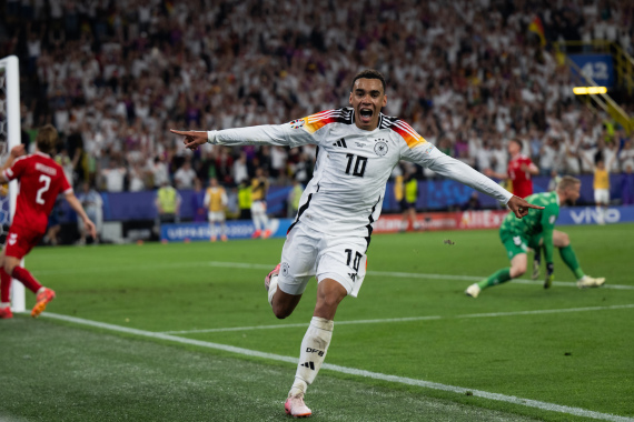 6月29日,德国队球员穆夏拉在进球后庆祝。当日,在德国多特蒙德举行的2024欧洲足球锦标赛八分之一比赛中,德国队2比0战胜丹麦队,晋级八强。新华社记者 肖艺九 摄