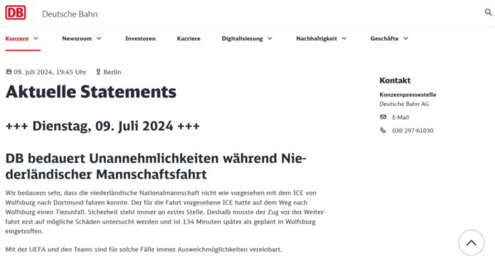 德铁公司当晚发布公告,对荷兰队遭遇的旅行不便表示歉意。