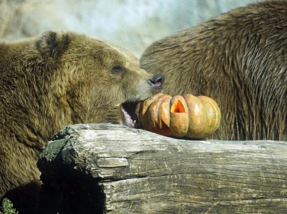 2022年10月30日,在意大利罗马动物园,棕熊享用节日南瓜。新华社记者金马梦妮摄