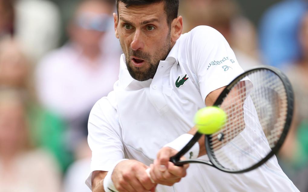 2024年7月14日,焦科维奇在比赛中回球。当日,在英国伦敦举行的2024温布尔登网球公开赛男单决赛中,西班牙选手阿尔卡拉斯3比0战胜塞尔维亚选手焦科维奇,再次获得冠军。新华社记者 李颖 摄