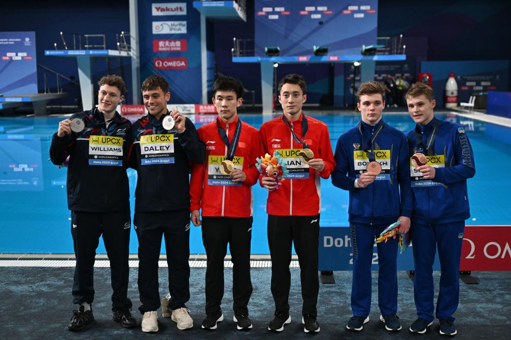 2月8日,在卡塔尔多哈举行的2024年世界游泳锦标赛跳水项目男子双人10米台决赛后,冠军中国组合练俊杰(右三)/杨昊(左三)、亚军英国组合戴利(左二)/威廉姆斯(左一)、季军乌克兰组合博柳赫(右二)/谢列达在颁奖仪式后合影。新华社记者 薛宇舸 摄