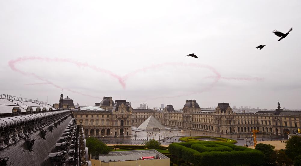 7月26日,开幕式上飞机拉出的心形烟雾漂浮在巴黎圣母院上空。新华社记者 夏一方 摄