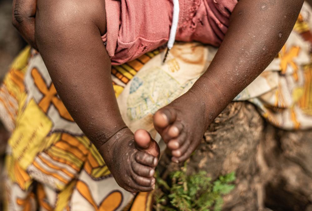 8月15日,在刚果(金)北基伍省首府戈马市附近尼拉贡戈地区的一座医院里,一名感染猴痘病毒的儿童展示皮肤症状。新华社发(扎南摄)