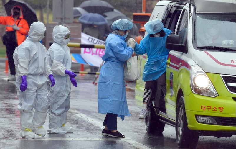 2020年3月7日,在韩国大邱,确诊患者乘坐救护车抵达大邱某传染病专科医院。新华社/纽西斯通讯社