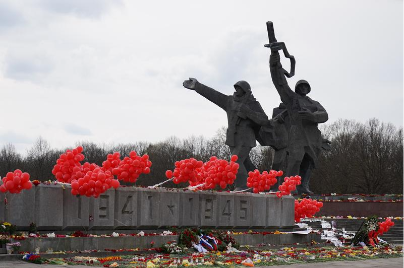这是2021年5月9日在拉脱维亚首都里加的胜利公园拍摄的解放者纪念碑前摆放的鲜花。新华社发(亚尼斯摄)