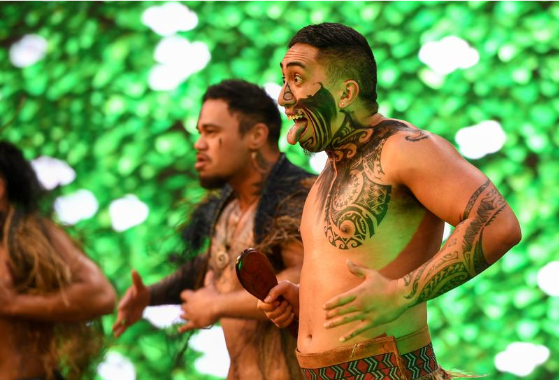 2020年7月19日,在新西兰奥克兰举行的毛利中国多元文化节上,毛利人表演哈卡战舞。新华社记者郭磊摄