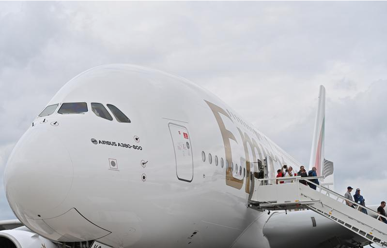 6月5日,在德国舍内费尔德,人们在2024柏林国际航空展上参观阿联酋航空公司空客A380-800客机。新华社记者任鹏飞摄