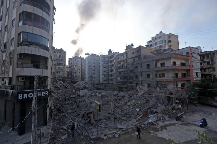 这是10月6日在黎巴嫩首都贝鲁特南郊拍摄的在以军空袭中受损的建筑。5日晚到6日凌晨,以军猛烈空袭黎巴嫩首都贝鲁特南郊的真主党目标。新华社发(比拉尔·贾维希摄)