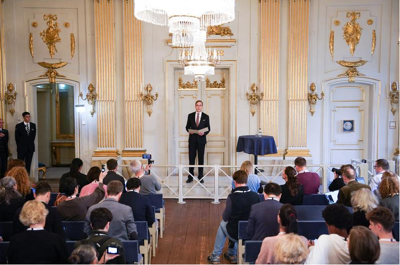 10月10日,瑞典文学院常任秘书马茨·马尔姆在斯德哥尔摩举行的新闻发布会上揭晓获奖者。瑞典文学院10日宣布,将2024年诺贝尔文学奖授予韩国女作家韩江,她成为首位获得诺贝尔文学奖的韩国作家。新华社记者彭子洋摄
